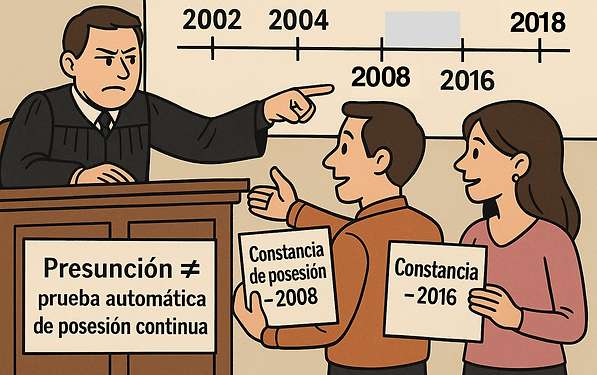 La Sala Superior declaró improcedente la demanda, señalando que las constancias no son pruebas concluyentes de posesión. Los demandantes interpusieron recurso de casación cuestionando. principalmente la inaplicación de la "presunción de continuidad", debido a que las constancias de posesión acreditaban la ocupación de los años 2008 y 2016, por lo que debía presumirse la posesión en el periodo intermedio.